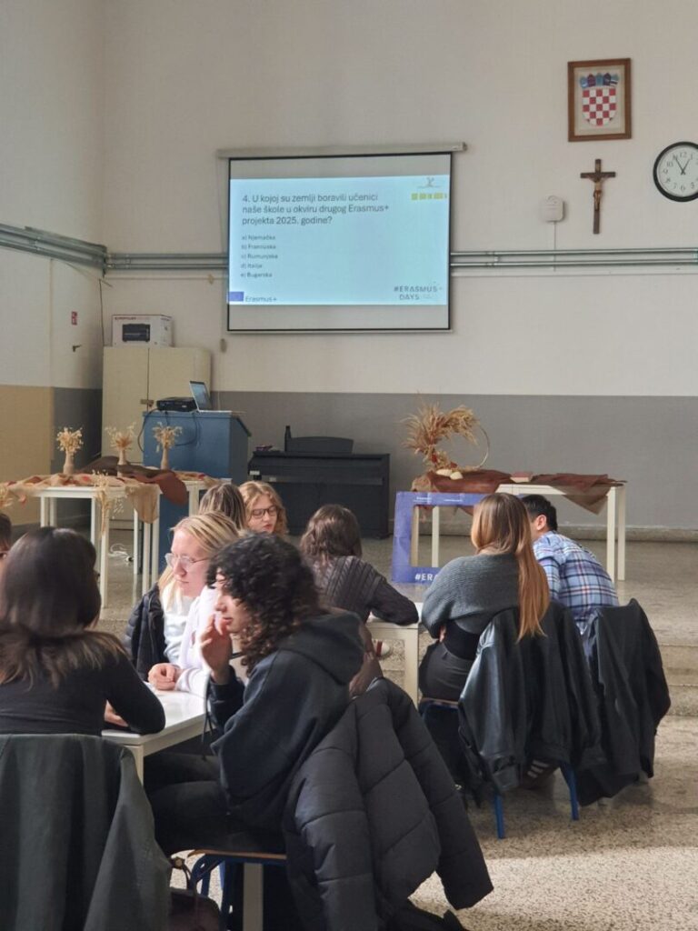 U okviru nacionalne inicijative obilježavanja Erasmus dana, 16. listopada 2025. godine u holu Srednje škole Marka Marulića Slatina održan je kviz znanja o Europskoj uniji i aktivnostima Erasmus+ projekta SEAS koji se provodi u našoj školi.