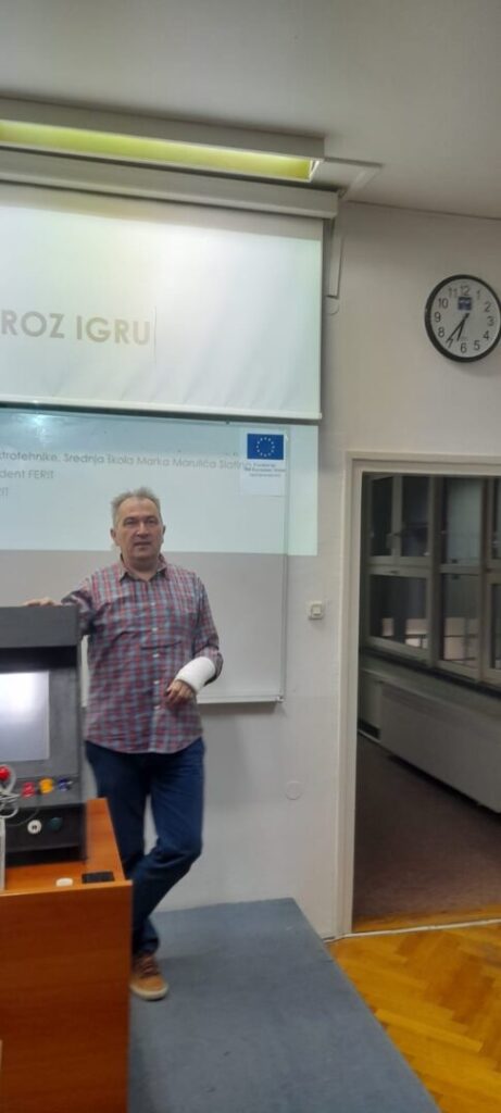 Predavanje je održao naš nastavnik Darko Špoljarić, uz podršku bivših učenika naše škole, danas studenata prve godine FERIT-a, Benjamina Bore Lazića i Noe Nemeta, na poziv profesora doc. dr. sc. Tomislava Rudeca. Ovaj susret bio je prilika da se pokaže kako znanja stečena u srednjoj školi mogu biti temelj za daljnji razvoj i uspjeh na fakultetu. Također, kroz ovo je predavanje napravljen pregled četiri godine rada na projektu Arduino kroz igru tijekom kojega su Benjamin i Noa s profesorom Špoljarićem kreirali razne digitalne igre te uspješno sudjelovali na brojim natjecanjima.