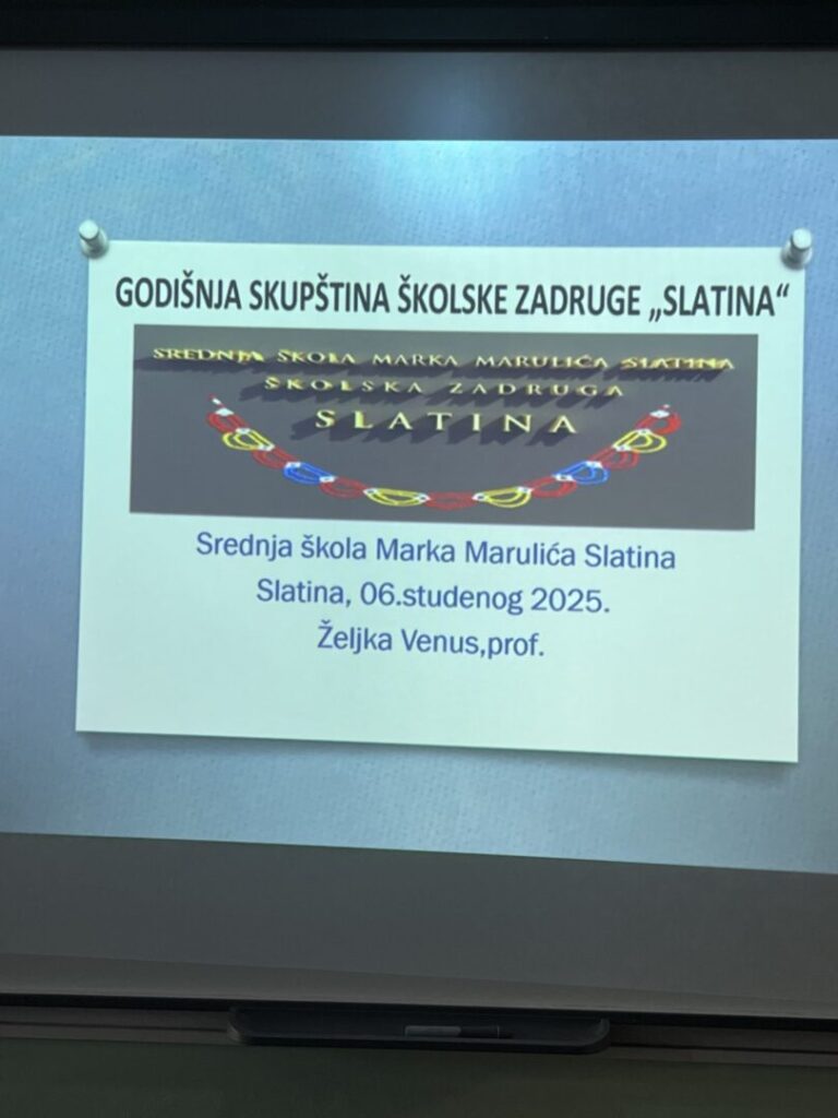 06. studenog 2025. godine održana je 11. redovna godišnja Skupština školske zadruge „SLATINA“ u Srednjoj školi Marka Marulića Slatina. Zamjenik ravnatelja Mario Gumbarević, mag. paed. et mag. educ. hist. otvorio je skupštinu i pozdravio sve prisutne.