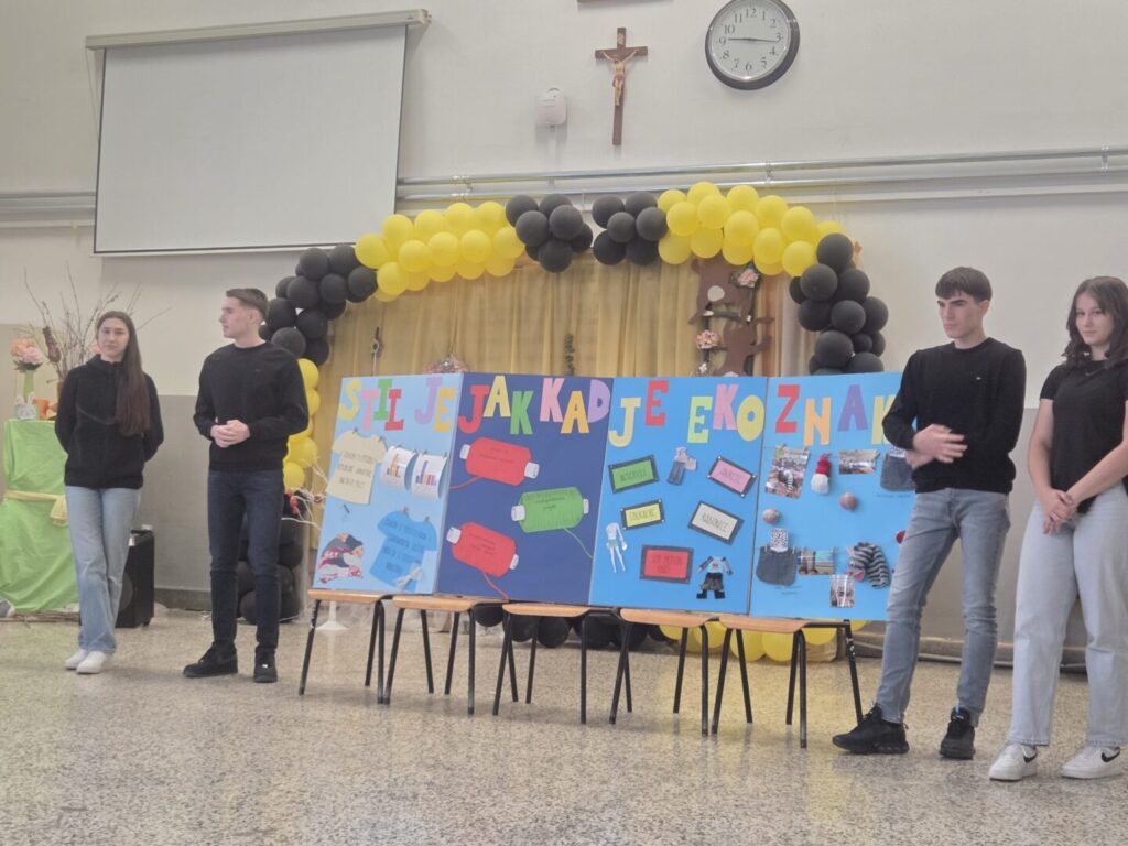Prvi korak bio je upoznati učenike s razmjerima problema. Izradili smo edukativne plakate s rezultatima naše ankete i činjenicama o zagađenju koje uzrokuje tekstilna industrija (posebno o mikroplastici iz sintetičke odjeće na koju su nas upozorili stručnjaci iz tvrtke Flora VTC). Plakate smo postavili u hol škole kako bismo potaknuli vršnjake na razmišljanje.