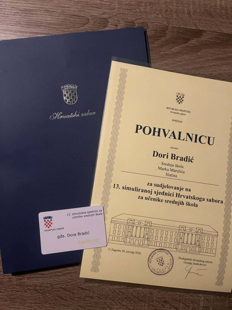 U Hrvatskom saboru (20. travnja 2026.) održana je 13. simulirana sjednica Hrvatskoga sabora za učenike srednjih škola. Na sjednici je  sudjelovao 160 učenika-zastupnika iz 57 škole iz cijele Hrvatske, a među njima, jedini iz Virovitičko-podravske županije, u ime Kluba zastupnika Srednje škole Marka Marulića Slatina i učenici naše škole: za govornicom su nastupiti Karlo Martinović i Iva Lovčanin, dok se s replikoma iz klupe  javila Dora Bradić. Mentor je učenicima profesor izvrsni savjetnik Zorislav Jelenčić. Tema ovogodišnje simulirane sjednice bila je Strategija demografske revitalizacije Republike Hrvatske do 2033. godine. Sjednica je trajala gotovo pet sati, a ovo je već dvanaesti put da učenici naše škole sudjeluju na simuliranim sjednicama na kojima je dosad nastupilo 75 učenika. Sjednicu je otvorio predsjednik Hrvatskoga sabora Gordan Jandroković, a naši su učenici citirani i dali izjave za različite televizije.